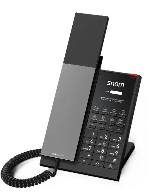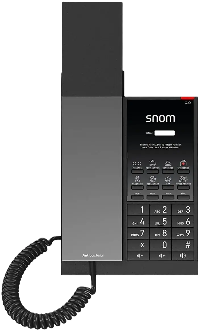 Le Snom HD350A se distingue par son élégance. Loin des téléphones blancs cliniques, sa finition sombre et moderne s’intègre parfaitement dans les décorations intérieures contemporaines. Mais le style ne sacrifie pas la sécurité : son plastique est traité avec un revêtement antibactérien (norme JIS-Z2801) qui empêche la prolifération des germes, une caractéristique rassurante et indispensable pour vos clients post-Covid.